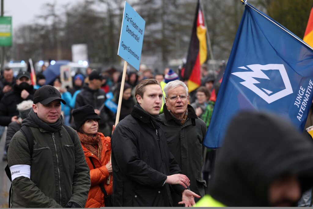 Amir Imeri mit Ordnerbinde, neben Kevin Dorow und Gereon Bollmann beim AfD Aufmarsch am 25.01.20225 in Neumünster. |Foto von Pixelarchiv