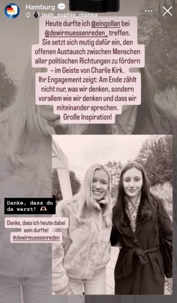 Die Veranstaltung ist Teil einer Reihe die dem ermordeten US-amerikanischen extremen rechten Charlie Kirk gewidmet ist. Die als Dialog angekündigte Veranstaltung, entpuppte sich, nichts anderes war zu erwarten, als ein Monolog von Antisemiten und Rassisten.